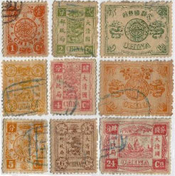 The first set of real Chinese stamps came into being in 1878 when the Post Office of the Qing Dynasty issued the Dalong or Giant Dragon stamps.They were printed from copperplate and bore the picture of a huge dragon against a background of clouds and waves. This set was issued three times: in 1878, 1882 and 1883. The yellow five-fen stamp with a wide margin, issued in 1883, is the rarest. Only one unused whole page exists in China and they are considered a treasure in Chinese stamps.
